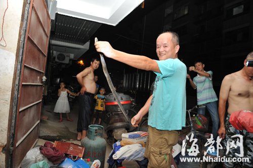 林先生有十多年的捕蛇经验,他拿着木棍,独自走进杂物间搜蛇,其他人只敢小心地在门外“观战”。林先生打打敲敲,一直没有看到蛇露头,就把杂物一一扔出门外。